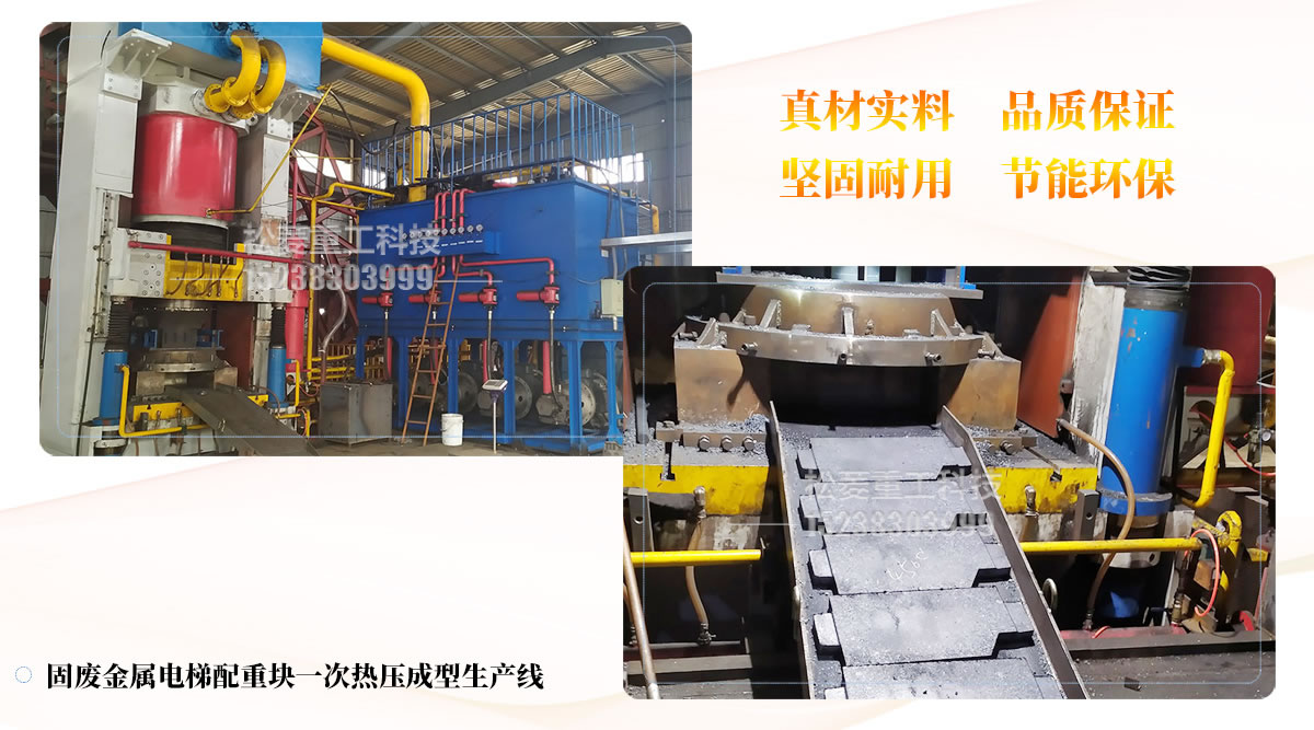 固廢金屬電梯配重塊一次熱壓成型生產線對鋼渣、粒子鋼、鋼屑、金屬破碎料、鋸床料、磨床料、生鐵銷、鐵精粉、氧化鐵皮、印尼紅土鎳礦等這些物料都能輕松達到不錯的展示效果。